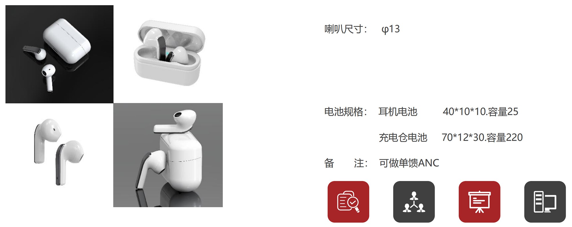 电池规格: 耳机电池 40*10*10.容量25、充电仓电池 70*12*30.容量220