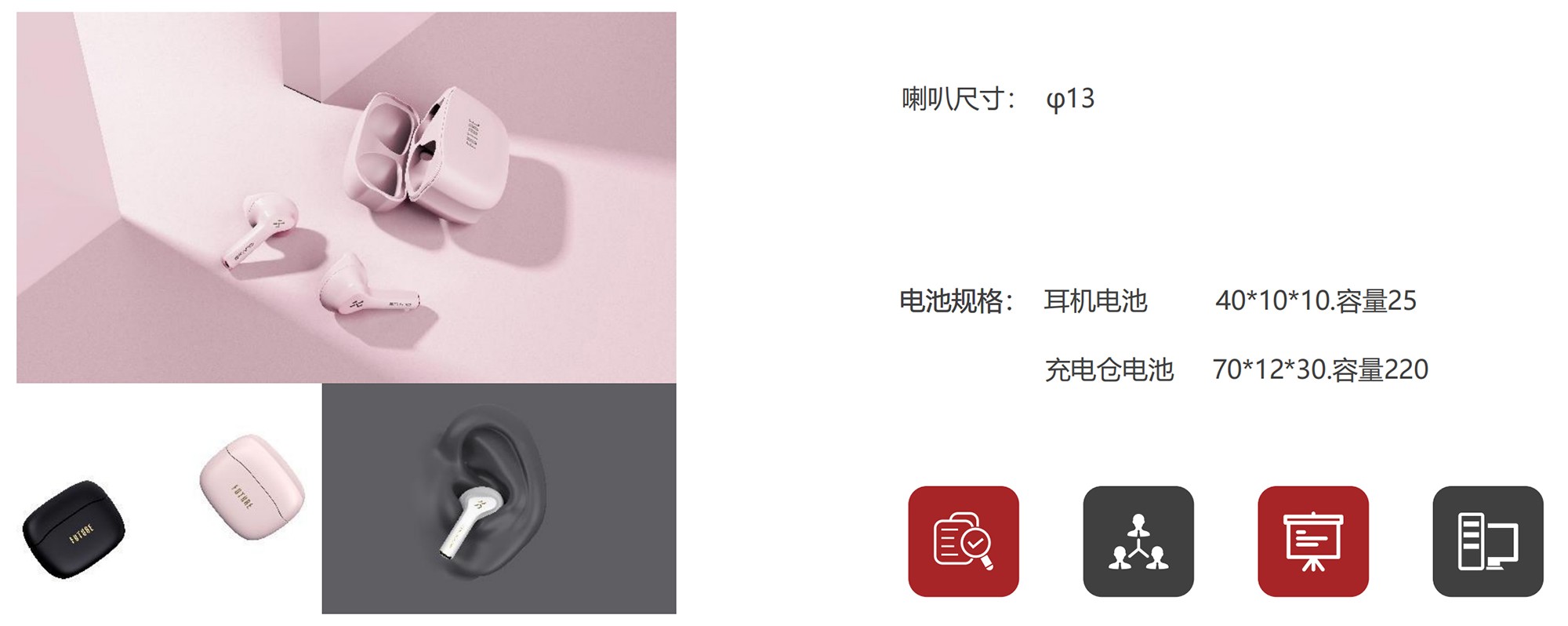 电池规格: 耳机电池 40*10*10.容量25、充电仓电池 70*12*30.容量220