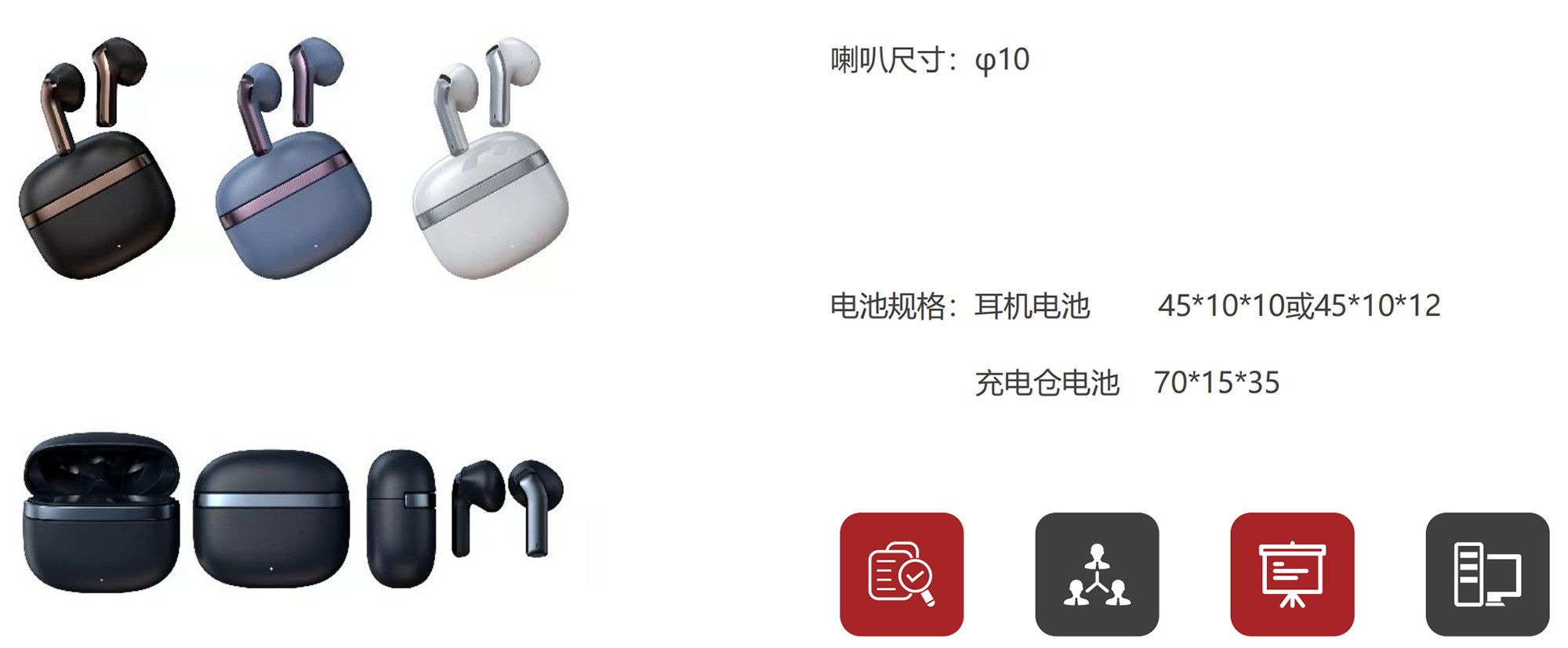 电池规格:耳机电池 45*10*10或45*10*12、充电仓电池 70*15*35