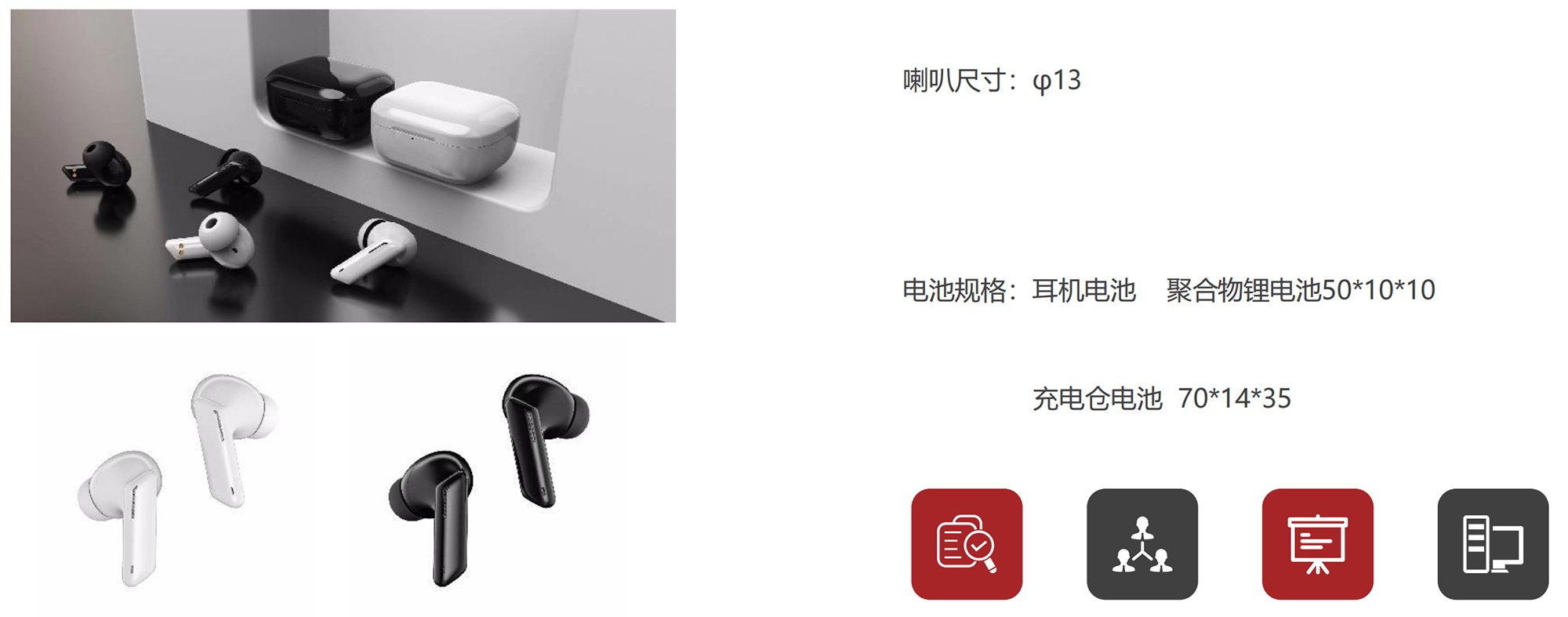电池规格:耳机电池 聚合物锂电池50*10*10 、充电仓电池 70*14*35