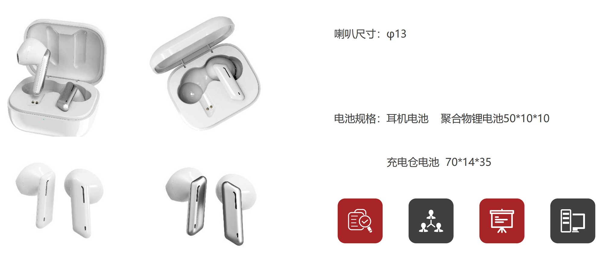 电池规格:耳机电池 聚合物锂电池50*10*10、充电仓电池 70*14*35